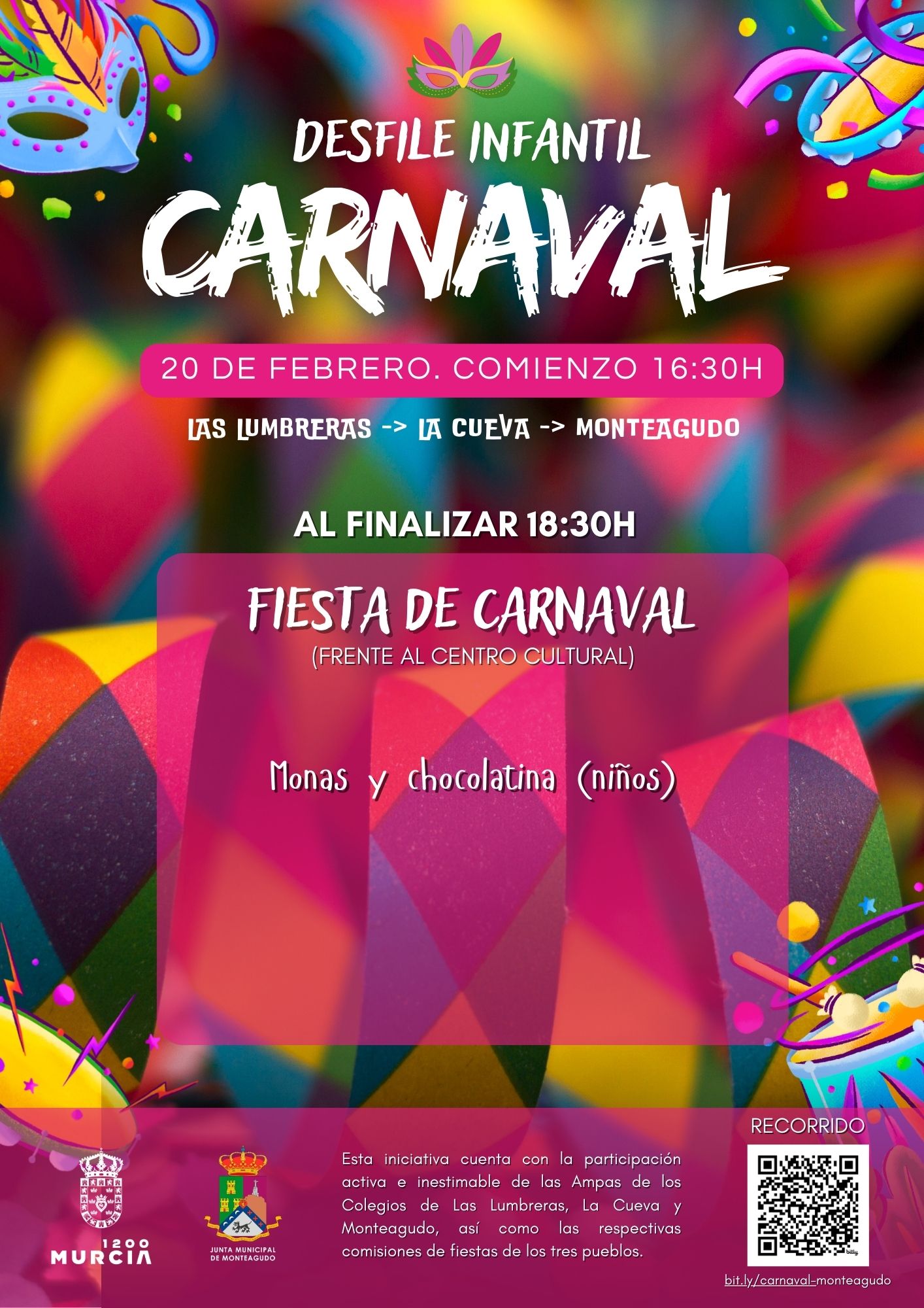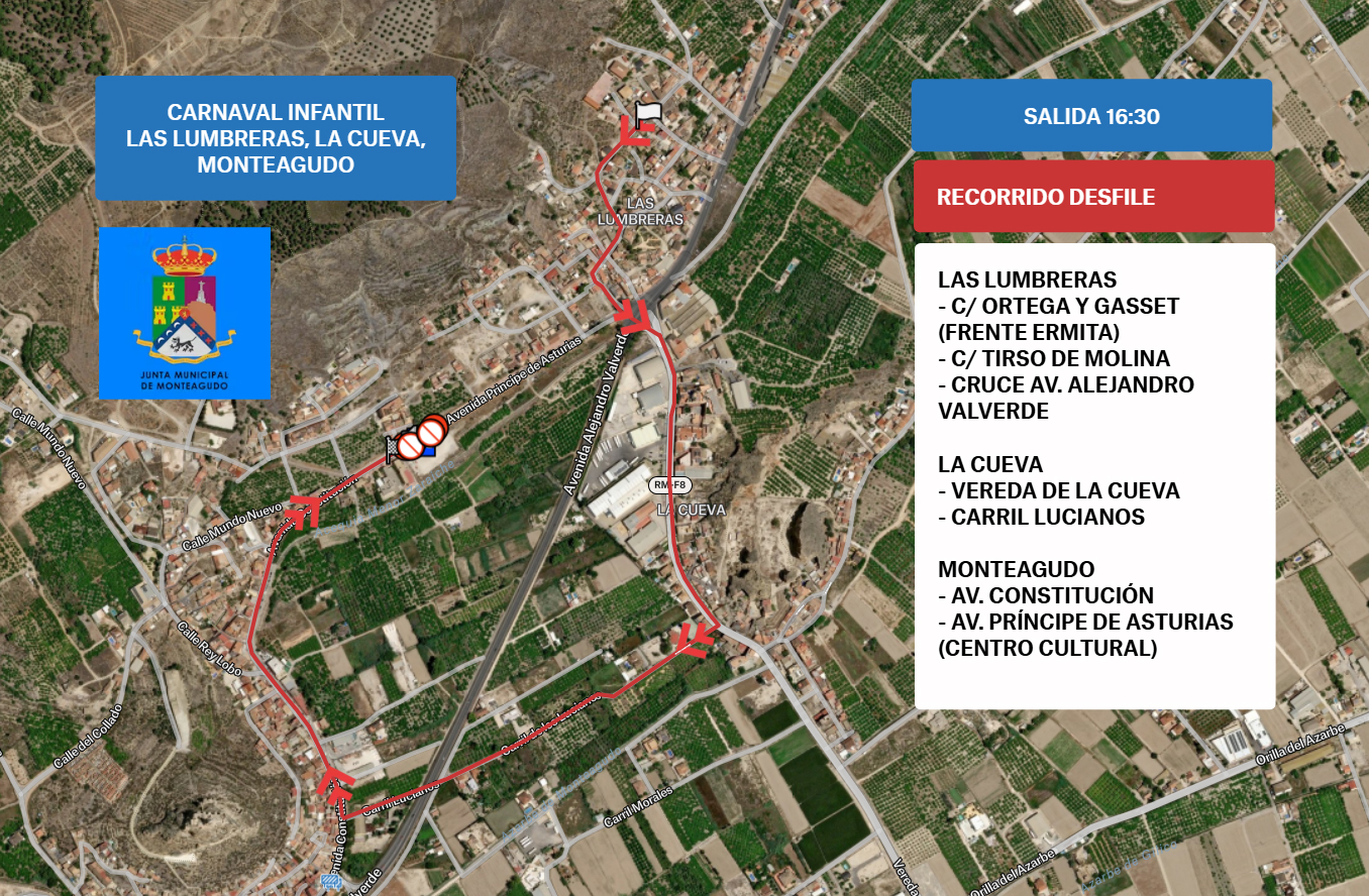El desfile comienza en Las Lumbreras las 16:30, después pasará por La Cueva y terminará en Monteagudo, con una gran fiesta final coordinada por las comisiones de fiestas de los tres pueblos. Música, hinchables, pintacaras, talleres infantiles, monas y chocolate (para los niños), rifas y barra con cena fría y refrescos serán el colofón a este gran día de convivencia entre pueblos vecinos.