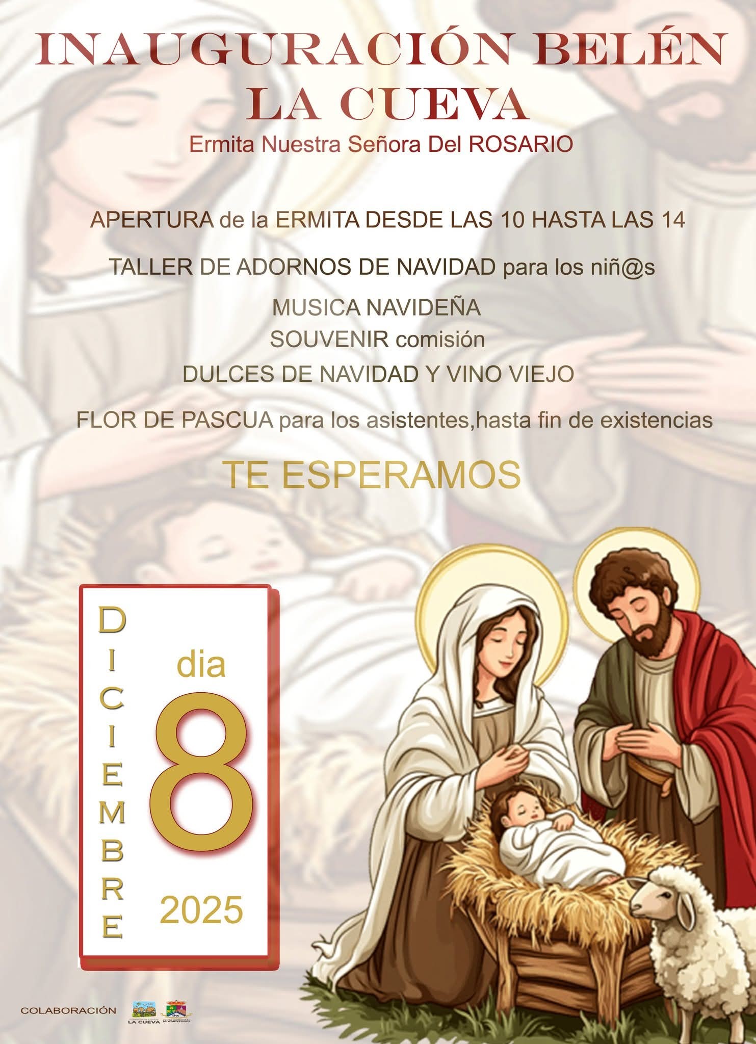 Como continuación, el domingo 8 de diciembre, en La Cueva, tendrá lugar la inauguración del Belén, en la Ermita. La Comisión de Fiestas ha preparado una jornada con actividades y animación para el disfrute de pequeños y mayores: